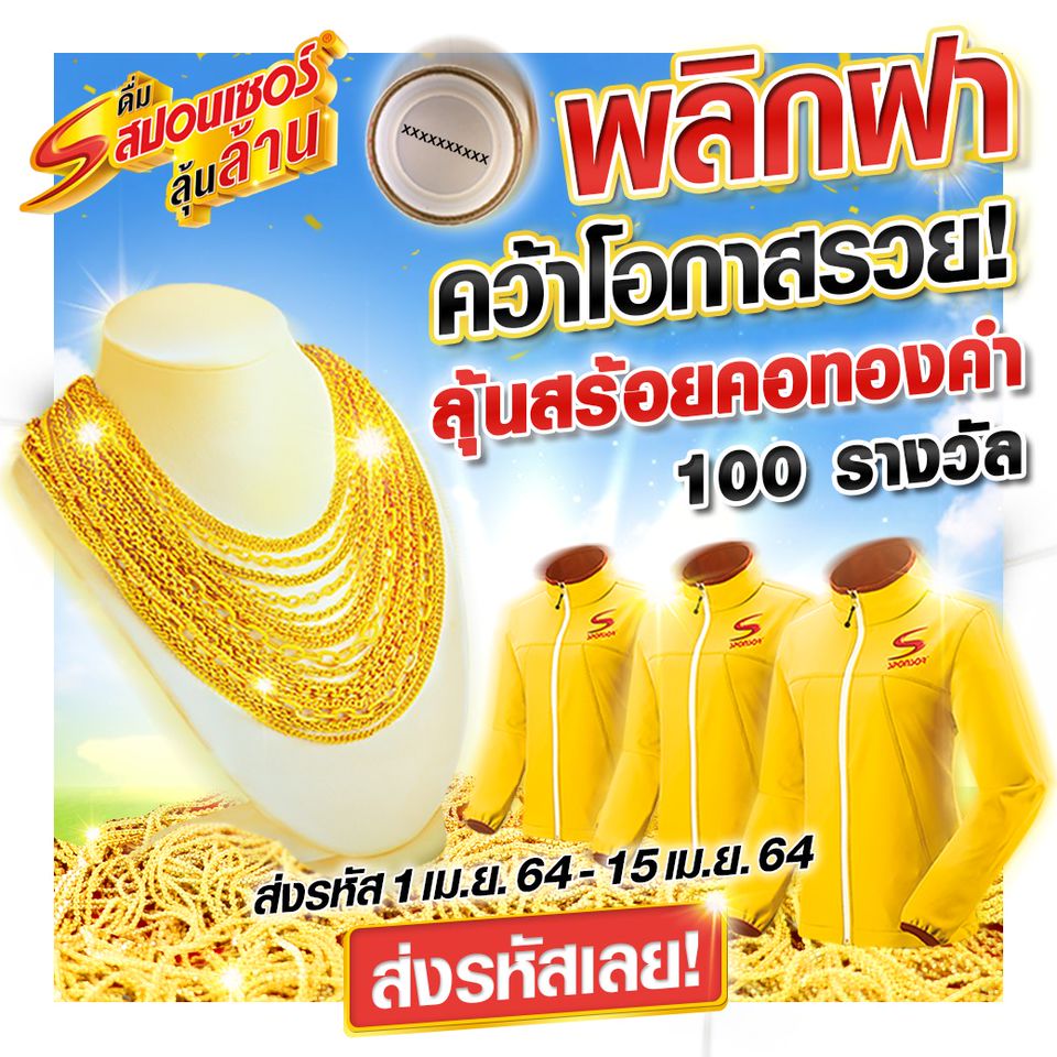 ส่งรหัสใต้ฝาเข้ามาลุ้นเป็นเจ้าของสร้อยคอทองคำ 100 เส้น และเสื้อแจ็คเก็ตสปอนเซอร์ไปใส่แบบคูลๆ อีก 400 รางวัล!